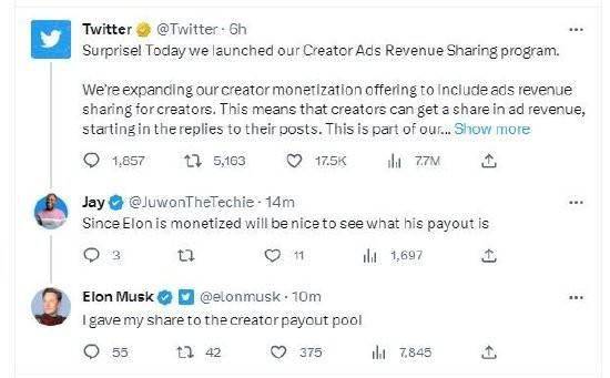 【CNMO新闻】推特近日宣布,自即日起正式启动其创作者广告收入分享计划。一位用户评论道:既然埃隆·马斯克被货币化了,我们很高兴看看他的分成是多少。马斯克回应称:我把我的那份给了创作者支付池。