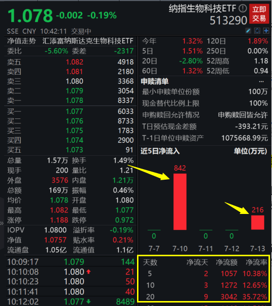 主流ETF方面,纳指生物科技ETF(513290)7月13日再度获资金增仓超200万元,近5日累计获资金净流入超1000万元,近20日内资金累计增仓金额超3000万元,净流入率高达35.72%!