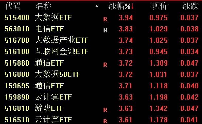 ETF方面,大数据、通信、互联网金融、游戏等相关ETF大涨逾3%。