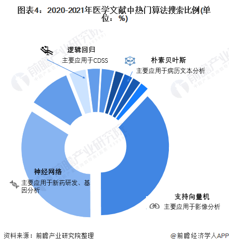 2012-2020年在医学文献中使用到的热门机器学习算法和深度学习算法包括:支持向量机(38%),主要应用于识别成像生物标志物和医疗影像分析;神经网络(34%),主要应用于生化分析、图像分析和药物开发;逻辑回归(4%),主要用于疾病风险评估和CDSS。AI医疗整体底层技术较为成熟,应用端准备充分。