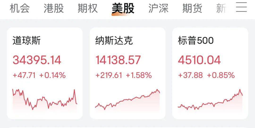 当地时间13日,美股三大股指集体收涨,纳指、标普500指数双双刷新2022年4月以来的新高。截至收盘,道指涨0.14%,报34395.14点;纳指涨1.58%,报14138.57点;标普500指数涨0.85%,报4510.04点。