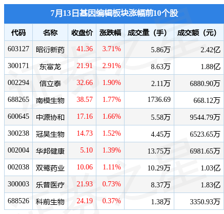 7月13日基因编辑板块较上一交易日上涨3.27%,昭衍新药领涨。当日上证指数报收于3236.48,上涨1.26%。深证成指报收于11095.44,上涨1.61%。基因编辑板块个股涨跌见下表: