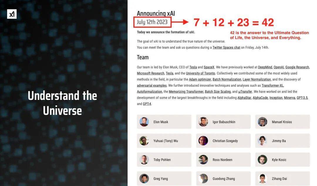 马斯克又接着在评论中附和,“最基本的未知问题又是什么?一旦你知道该问什么问题,答案往往是容易的,正如我的偶像道格拉斯·亚当斯所说的那样”,并附上了一张xAI官网介绍的截图,将公司成立日期标红,在旁边写道,“7+12+23=42”,7月12日显然别有深意,“42是生命、宇宙和万物终极问题的答案”。