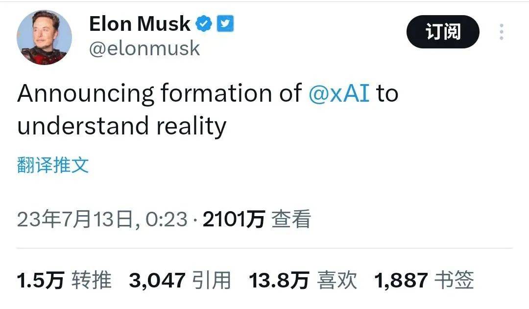 马斯克“杀入AI圈,剑指大模型”就是这么突然,北京时间7月13日0点23分,马斯克在Twitter上毫无征兆地宣布:“xAI宣告成立,为了理解现实。”