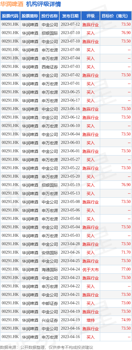 截至2023年7月13日收盘,华润啤酒(00291.HK)报收于50.4港元,上涨4.46%,换手率0.32%,成交量1027.88万股,成交额5.18亿港元。投行对该股的评级以买入为主,近90天内共有20家投行给出买入评级,近90天的目标均价为73.93港元。中金公司最新一份研报给予华润啤酒跑赢行业评级,目标价73.5港元。