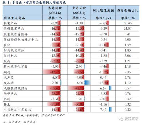 3)劳动密集型产品出口增速普遍回落。从七大劳动密集型产品来看,6月劳动密集型产品出口增速均进一步下滑,箱包及类似容器出口同比增速也由正转负。