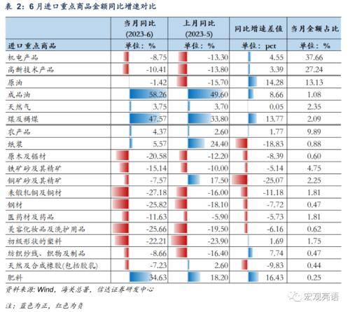 国内经济延续慢修复态势。6月进口同比增速降幅扩大,已连续4个月保持负增长。我们认为,当前进口增长偏弱,也和国内经济运行的多个信号相一致:一是大宗商品价格继续走弱,从价格端拖累进口同比增速;二是6月企业进口景气度环比回落,从数量端拖累进口金额;三是企业仍处于去库存阶段。商品结构上,进口同比增速下滑的范围进一步扩大,显示出国内经济修复偏慢的格局还没发生改变 ,主要有以下几个体现: 1)铜矿砂、钢材等工业品进口弱,与国内工业需求偏弱相吻合。2)能源类商品进口增速改善,成品油、煤及褐煤和肥料进口增速保持高增。3)多数商品进口同比增速进一步下滑的范围继续扩大。