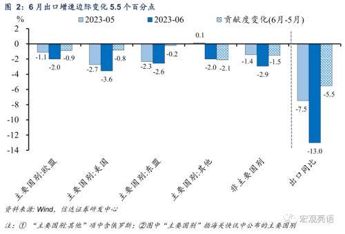 分区域来看贡献度变化,6月出口同比增速继续下降的5.5个百分点中,欧美、东盟市场边际拖累1.9 pct,占比35%;其他非欧美、非东盟市场边际拖累3.6个百分点,占比65%(见图2)。