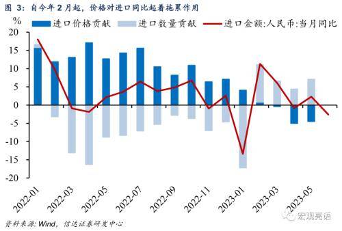 第一个信号是大宗商品价格继续走弱,从价格端拖累进口同比增速。从量价角度上看,自今年2月份起,价格因素拖累进口同比增速表现。而在全球经济增长放缓背景之下,大宗商品价格继续下跌,我们认为6月大宗商品价格下降继续对进口起着拖累作用,从而影响当下进口表现。