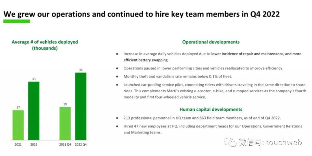 Marti在2022年第四季度营收为630万美元,较上年同期的340万美元增长84%;净亏损为494.7万美元,上年同期的净亏损为851.2万美元;经调整EBITDA为-387万美元,上年同期的经调整EBITDA为-117万美元。