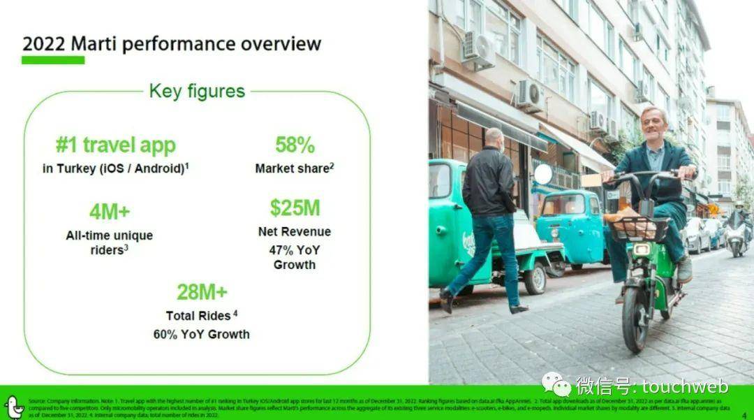 此后,Marti增加了电动自行车、轻便摩托车和拼车服务,目前在土耳其16个城镇开展业务。Marti的竞争对手包括迪拜的Fenix、荷兰的Go Sharing和土耳其本土的Binbin 。