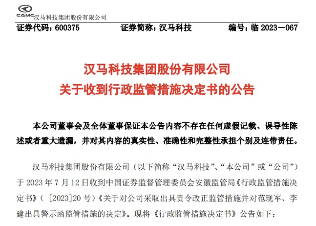 根据相关规定,安徽证监局决定对汉马科技采取责令改正的行政监管措施,并记入证券期货市场诚信档案,于收到决定书之日起 30日内提交书面整改报告。同时,对范现军、李建采取出具警示函,并记入证券期货市场诚信档案。