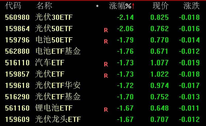 下跌方面,赛道股陷入调整,多只光伏、电池相关ETF跌幅居前。
