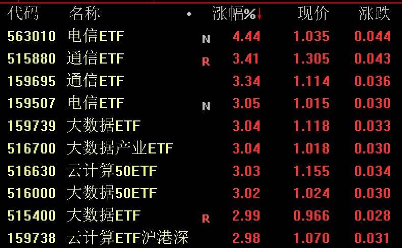 ETF方面,电信ETF涨超4%,通信、大数据、云计算相关ETF涨超3%。