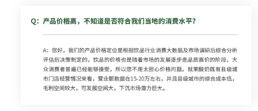 值得注意的是,茉酸奶在加盟问答中也就产品高价问题进行了答复,称茉酸奶产品价格定位是根据饮品行业消费大数据及市场调研及综合评估后决策制定的,也是随着市场发展逐步走品质高价的阶段,大众消费者普遍已经能够接受,所以不用太担心价格问题。就茉酸奶既有县级城市门店经营情况来看,营业额数据在15万元—20万元。
