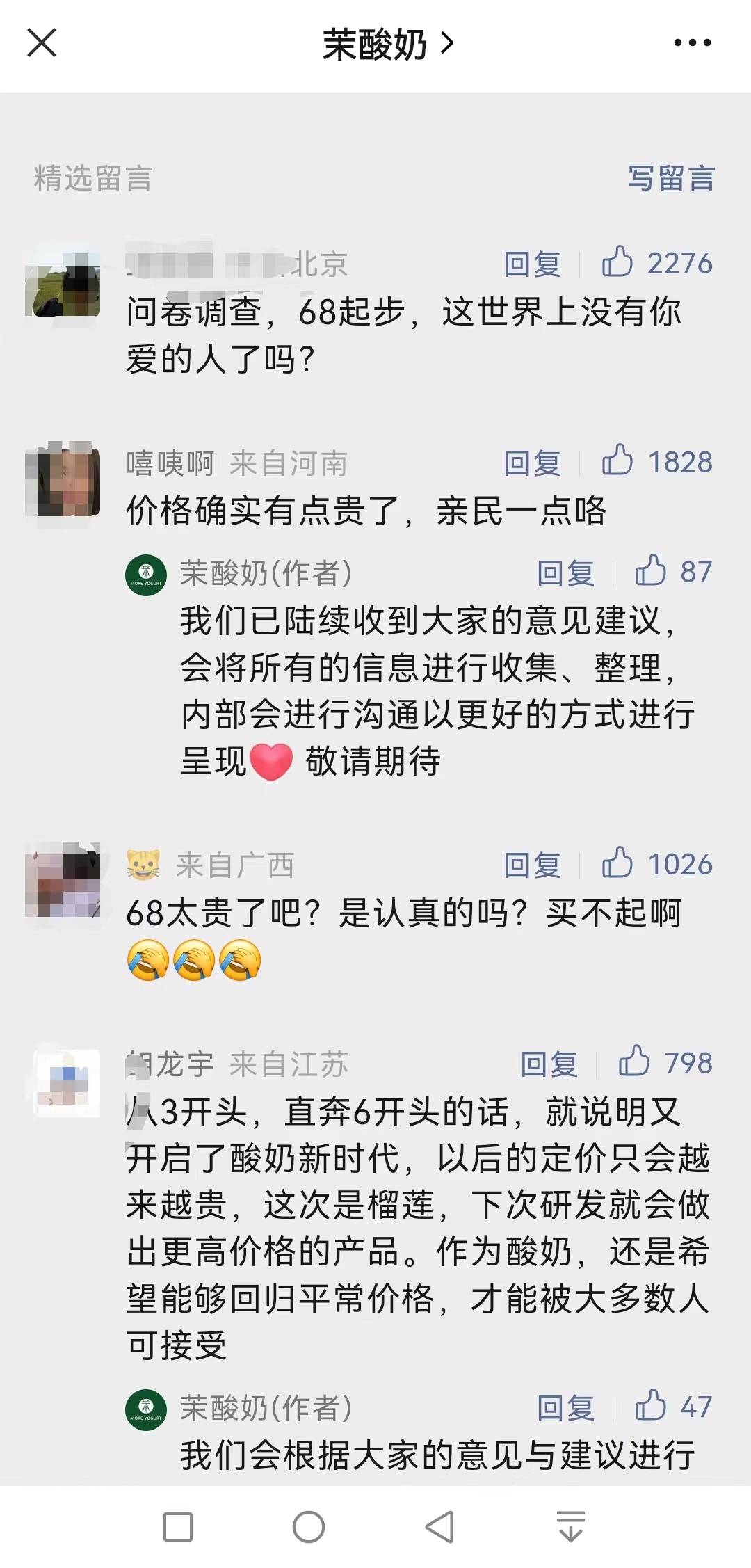 在该条微信下方,不少网友留言“价格确实有点贵了”,“68太贵了吧,是认真的吗?买不起啊”,“从3开头,直奔6开头的话,就说明开启了酸奶新时代,以后定价会越来越贵。还是希望能够回归平常价格,才能被大多数人接受”。面对网友质疑,茉酸奶在微信下方答复称,“会根据大家的意见与建议进行调整”,并称会进行改进。