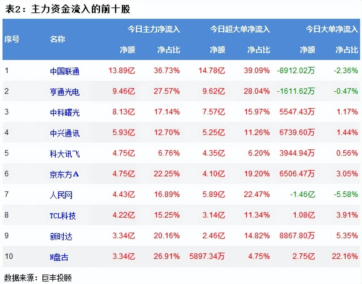 从两市个股主力资金流向来看,中国联通获主力资金净流入13.89亿,亨通光电获主力资金净流入9.46亿,中科曙光获主力资金净流入8.13亿,中兴通讯获主力资金净流入5.93亿,科大讯飞获主力净流入4.75亿。