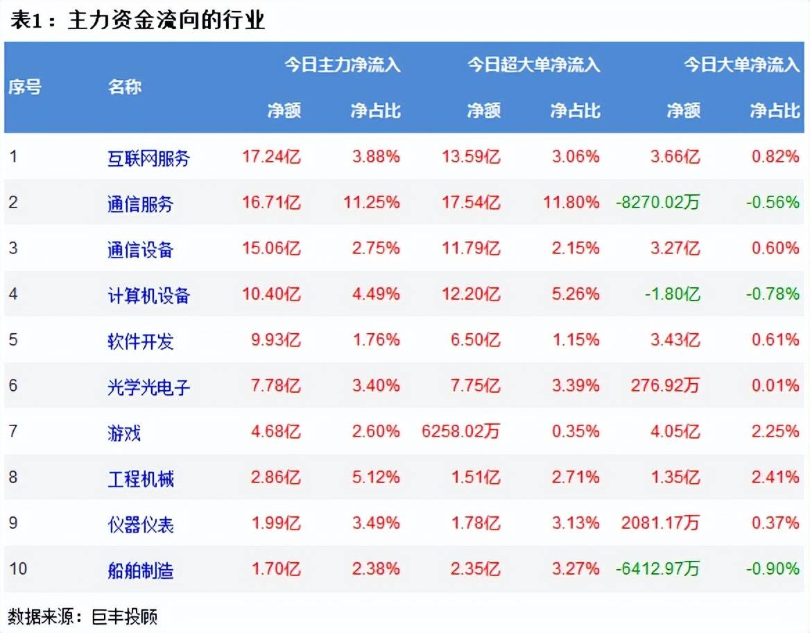 从两市行业板块资金流向来看,互联网服务板块获主力资金净流入17.24亿,通信服务板块获主力资金净流入16.71亿,通信设备板块主力资金净流入15.06亿,计算机设备行业主力资金净流入10.40亿,软件开发板块主力净流入9.93亿。