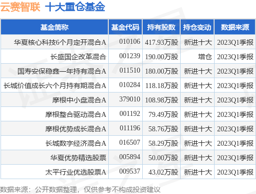 重仓云赛智联的前十大公募基金请见下表: