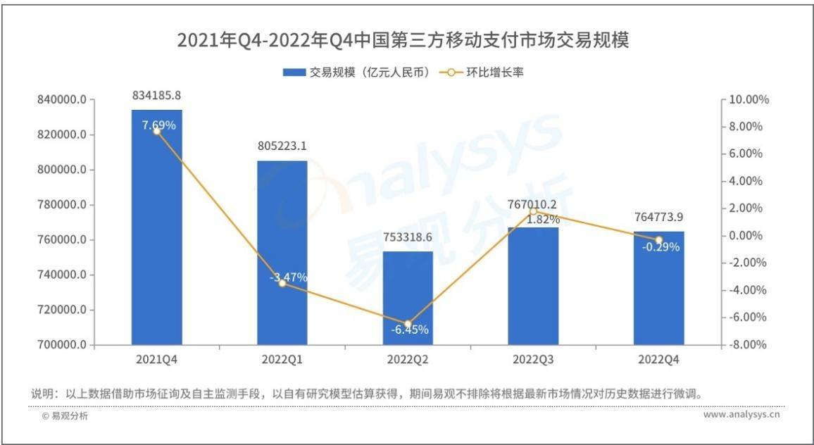 2021年Q4到2022年Q4,我国第三方移动支付市场规模的增速已经从7.69%下降到了-0.29%。与之相对应,交易规模也从83万亿元下降到了76万亿元。同时,2022年第三方支付的交易笔数和金额分别下降0.4%和4.95%。