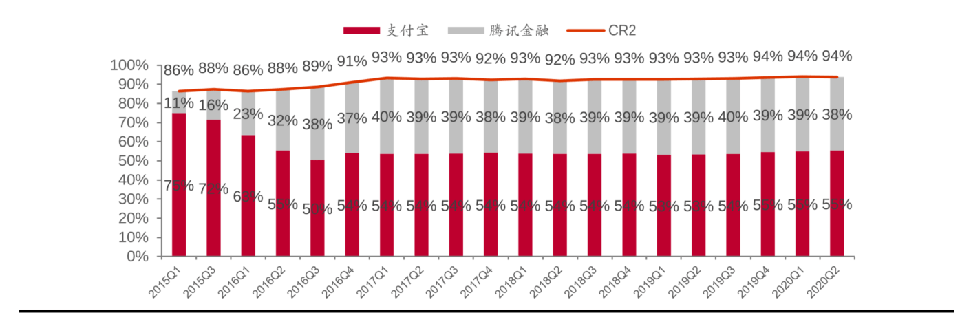 除此之外,第三方支付市场还面临集中度过高的问题。截至2022年第二季度,支付宝和腾讯金融分别占整个市场的55%和38%,总计占比高达94%。这意味着,将近200家支付厂商要争夺剩下6%的市场。