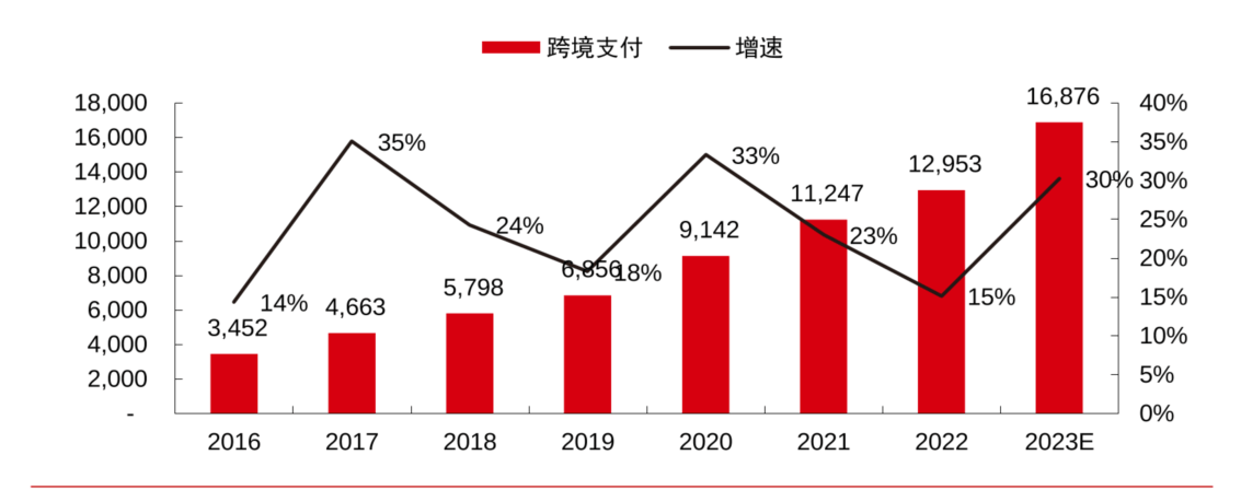 更关键的是,跨境业务的增长空间依然可期。根据联合国贸发会议的数据显示,2022年全球贸易总额为32万亿美元,再一次刷新历史。其中,货物贸易增长10%,服务贸易增长15%。这意味着,跨境电商及跨境支付在未来依然有很大的机会。数据显示,2020年到2022年,跨境支付的市场规模从9142亿元提高到1.3万亿元,增速保持在15%~33%。