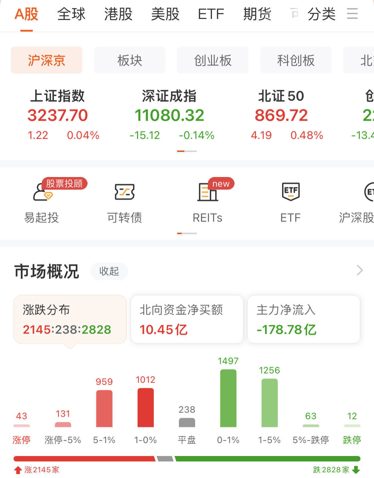 个股跌多涨少,两市超2800只个股下跌。沪深两市今日成交额9225亿,较上个交易日放量17亿。北向资金全天净买入10.45亿元,其中沪股通净买入11.77亿元,深股通净卖出1.32亿元。