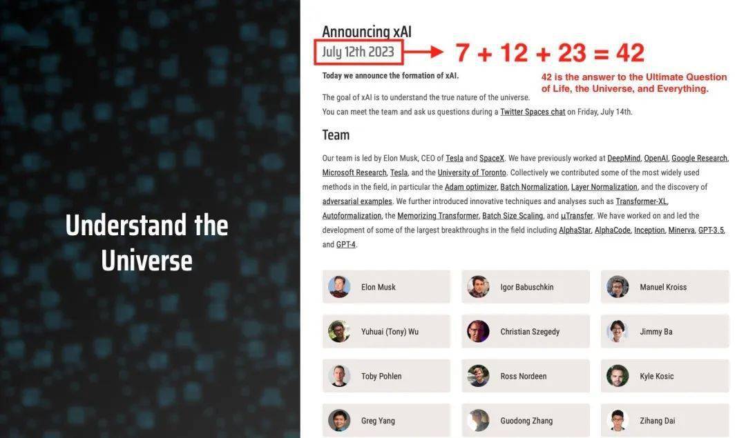 马斯克又接着在评论中附和,“最基本的未知问题又是什么?一旦你知道该问什么问题,答案往往是容易的,正如我的偶像道格拉斯·亚当斯所说的那样”,并附上了一张xAI官网介绍的截图,将公司成立日期标红,在旁边写道,“7+12+23=42”,7月12日显然别有深意,“42是生命、宇宙和万物终极问题的答案”。