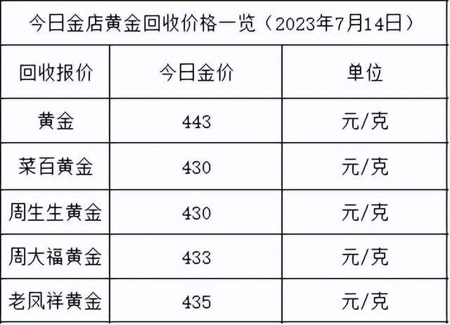 今日金价保持不变,黄金回收价格则是微涨,涨幅为2元/克。同时,每个品牌的回收价格也不一样,小金大致整理了几个,详见下表,数据仅供参考: