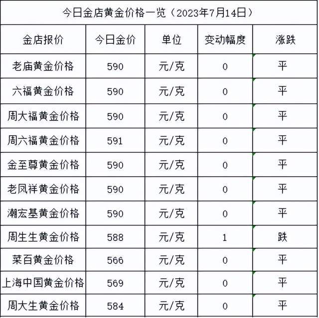 今天是7月14日,各大金店黄金价格在昨日涨破590元/克之后,今天不涨不跌,只有周生生微跌1元,金店黄金价格真的是易涨难跌。目前,金价最高的金店为周六福,不涨不跌,报价591元/克。而金价最低的金店也还是菜百,价格依旧不变,报价566元/克。今日黄金价格高低差为25元/克,价差较大。
