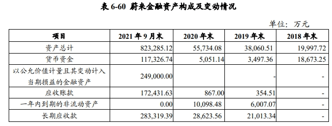 截至2021年9月末,蔚来金融的资产总计为82.33亿元,货币资金11.73亿元,应收账款17.24亿元。