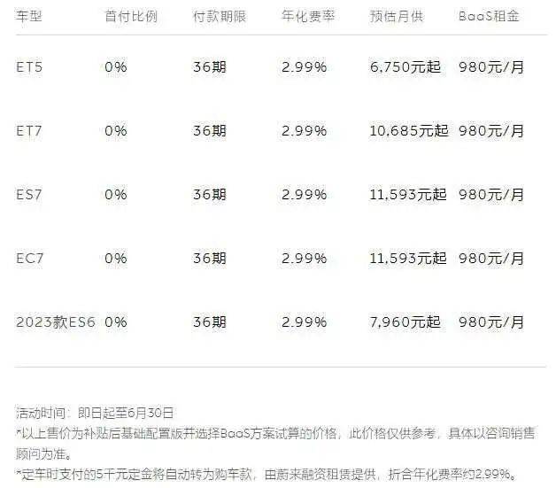 此外,官网另附说明,活动时间为即日起至6月30日。以上售价为补贴后基础配置版并选择BaaS方案试算的价格,此价格仅供参考,具体以咨询销售顾问为准。定车时支付的5千元定金将自动转为购车款,由蔚来融资租赁提供,折合年化费率约2.99%。