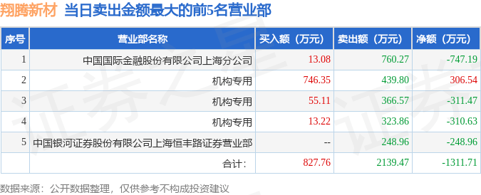 沪深交易所2023年7月14日公布的交易公开信息显示,翔腾新材(001373)因日换手率达到20%的前5只证券登上龙虎榜。此次是近5个交易日内第1次上榜。