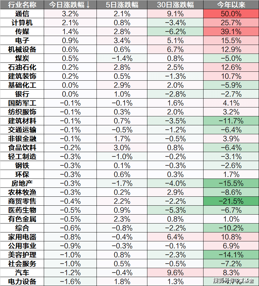 行业上来看,通信、计算机、传媒领涨,电力设备、汽车、社会服务下跌。