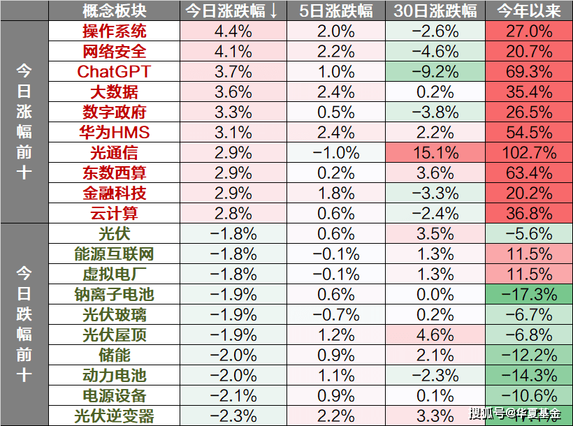 概念主题方面,操作系统、网络安全、ChatGPT板块领涨,光伏逆变器、电源设备、动力电池板块下跌。