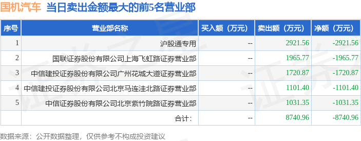 沪深交易所2023年7月14日公布的交易公开信息显示,国机汽车(600335)因有价格涨跌幅限制的日收盘价格跌幅偏离值达到7%的前五只证券登上龙虎榜。此次是近5个交易日内第1次上榜。