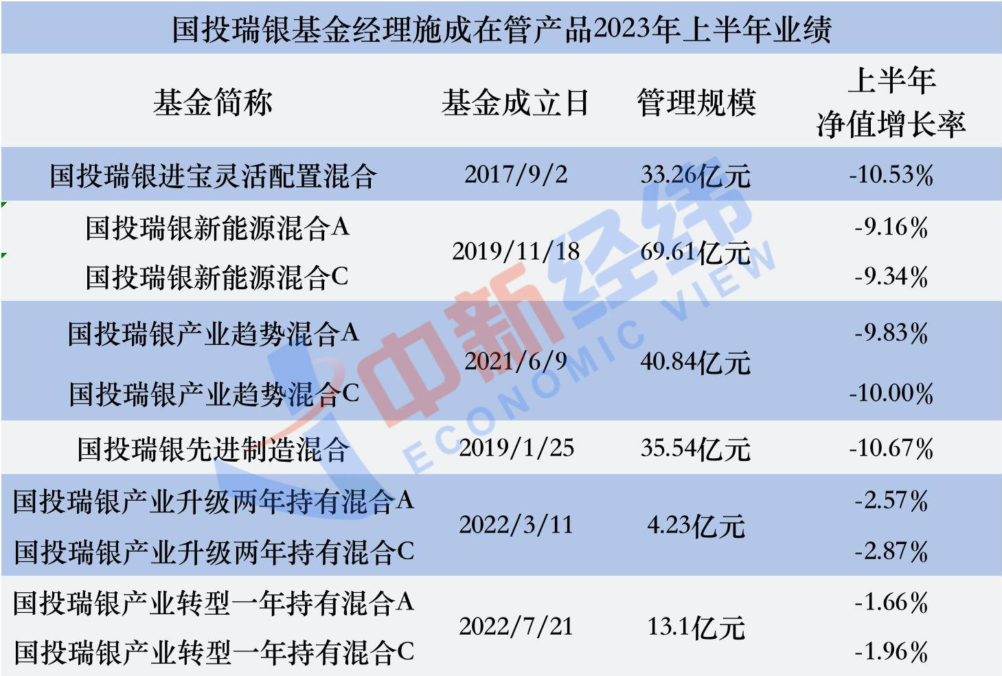 二季度,国投瑞银产业升级两年持有A、国投瑞银进宝混合、国投瑞银新能源混合A、国投瑞银产业趋势混合、国投瑞银先进制造混合的净值增长率分别为-0.91%、-5.59%、-4.80%、-5.08%、-5.47%。整个上半年,上述产品的净值增长率分别为-2.57%、-10.53%、-9.16%、-9.83%、-10.67%。