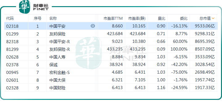 富途牛牛数据显示,总市值排名靠前的九大家保险股中,中国平安、中国人寿、中国太保等5家险企市盈率(TTM)均低于10倍;市净率方面,中国平安、中国人寿、宏利金融、中国太保、中国财险5家险企均低于1倍。