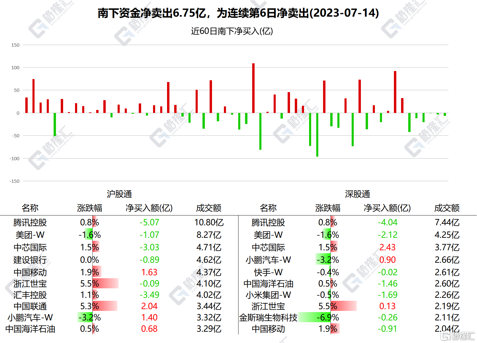 南下资金净卖出港股6.75亿港元,已连续6日净卖出。其中,港股通(沪)净卖出7.5亿港元,港股通(深)净买入7501.54万港元。