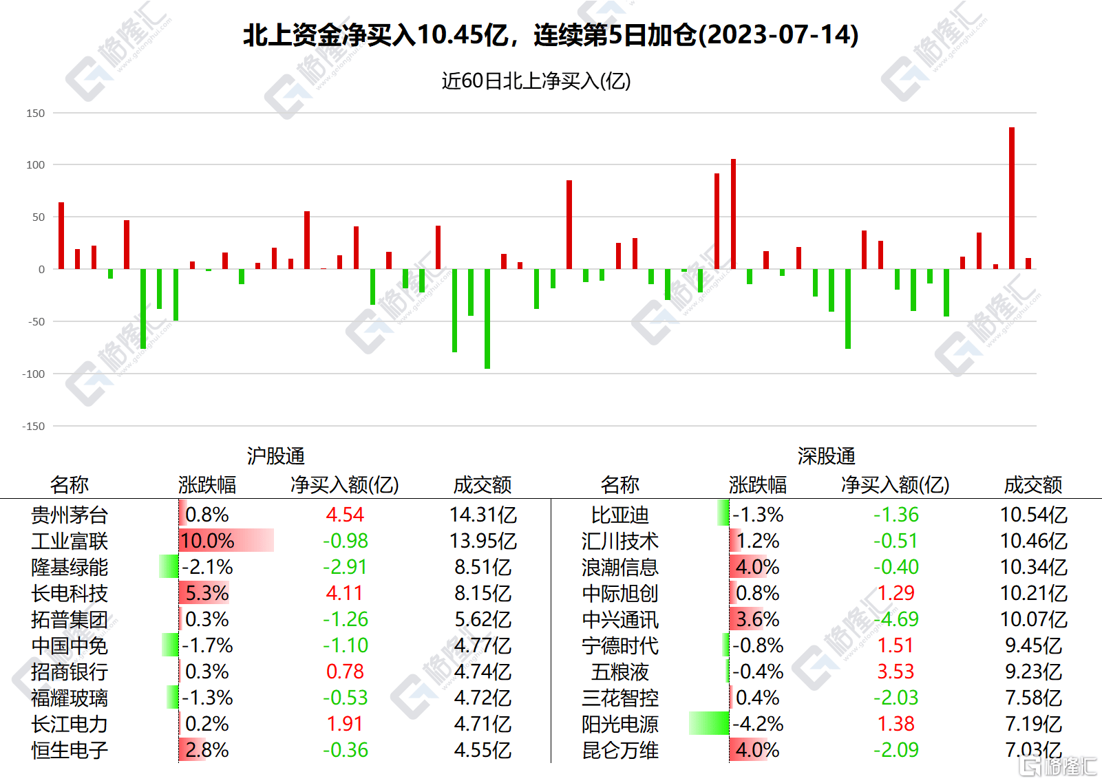 7月14日,北上资金全天净买入A股10.45亿元,为连续第5天净买入。其中,沪股通净买入11.77亿元,深股通净卖出1.32亿元。本周5个交易日连续加仓累计198.44亿元,单周净买入额创逾5个月新高。