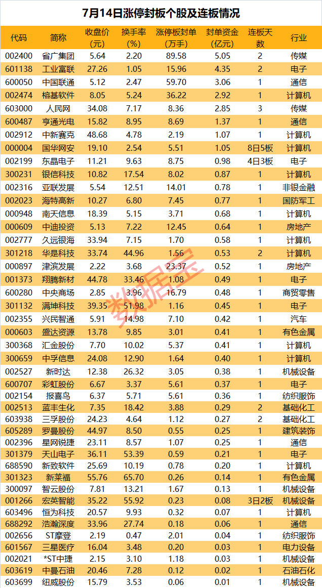 7月14日,沪深两市43股涨停,包含2只ST股。另外,11股封板未遂,整体封板率为79%。
