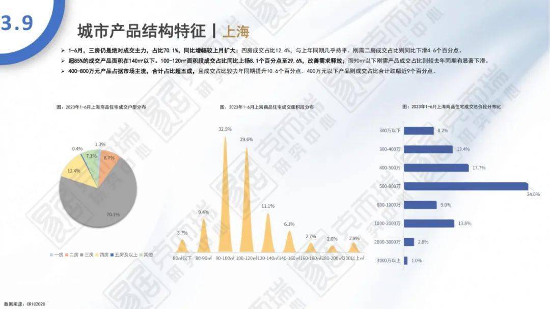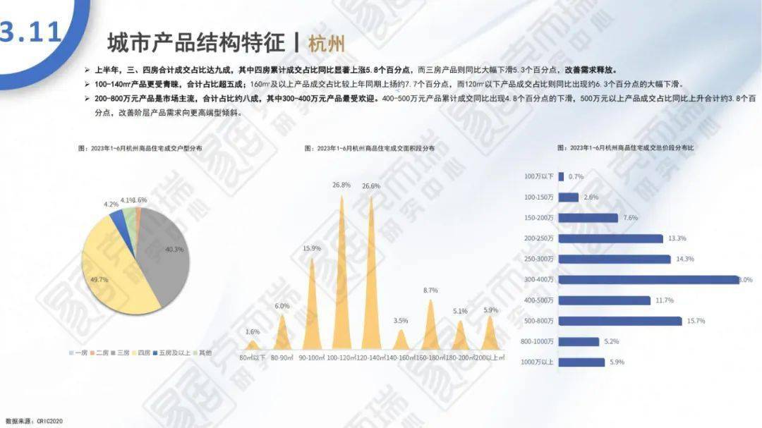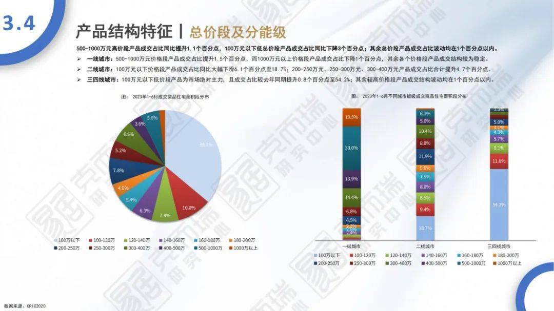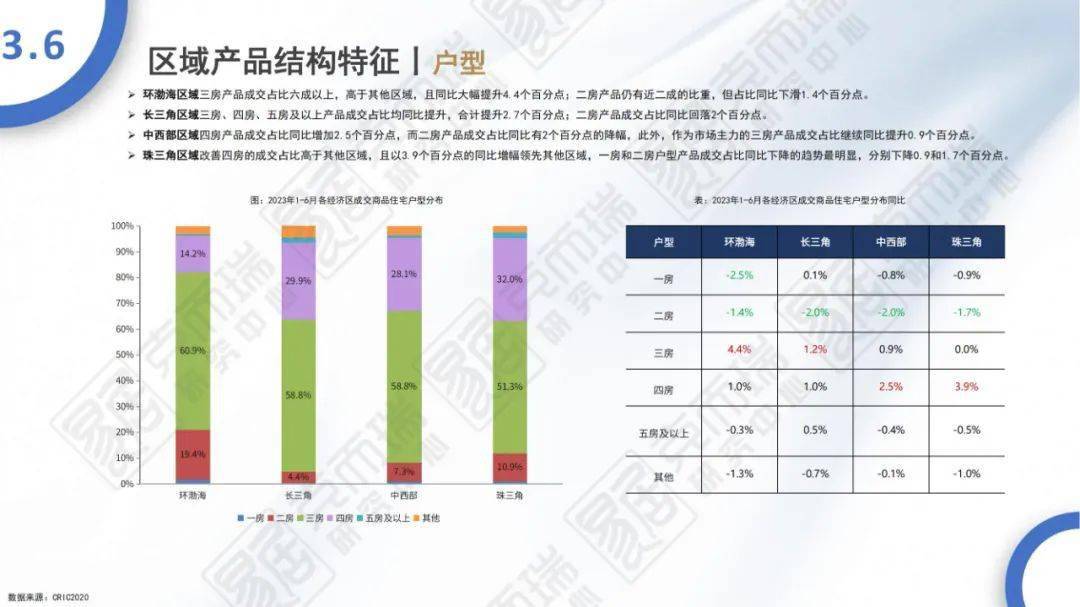 - 上半年,500-1000万元高价段产品成交占比同比提升1.1个百分点,100万元以下低总价段产品成交占比同比下降3个百分点;其中二线城市100万元以下价格段产品成交占比同比大幅下滑6.1个百分点至18.7%。户型方面,长三角区域三房、四房、五房及以上产品成交占比均同比提升,合计提升2.7个百分点;中西部、珠三角区域的改善四房成交占比分别提升2.5、3.9个百分点。