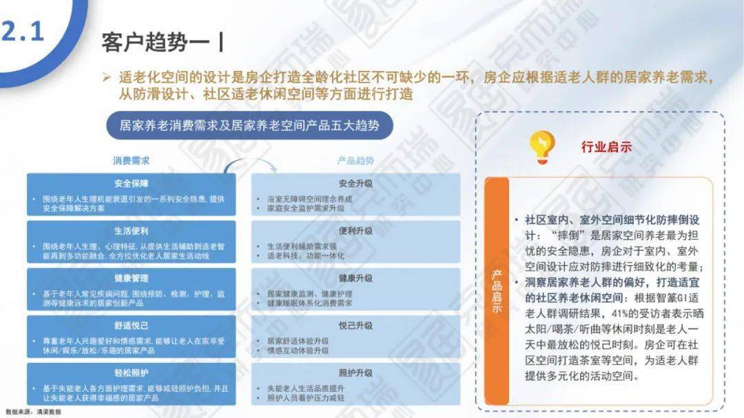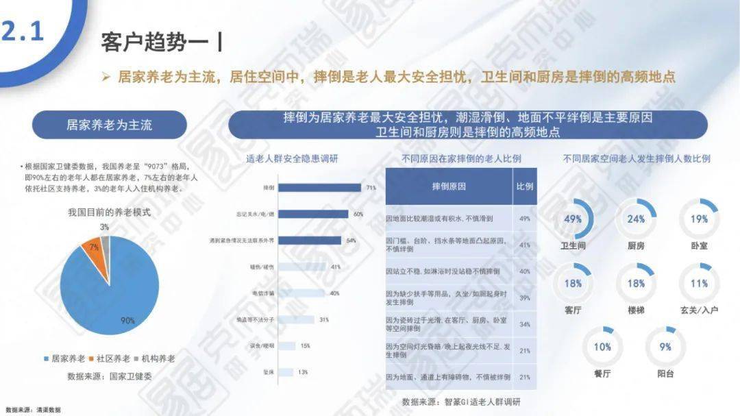 - 居家养老为主流,居住空间中,摔倒是老人最大安全担忧,卫生间和厨房是摔倒的高频地点;适老化空间的设计是房企打造全龄化社区不可缺少的一环,房企应根据适老人群的居家养老需求,从防滑设计、社区适老休闲空间等方面进行打造。