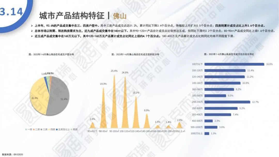 - 上半年,上海100-120㎡面积段成交占比同比上扬8.1个百分点至29.6%,改善需求释放。杭州400-500万元产品累计成交同比出现4.8个百分点的下滑,500万元以上产品成交占比同比上升合计约3.8个百分点,改善阶层产品需求向更高端型倾斜。佛山近五成产品成交集中在160万元以下,180-400万元产品累计成交占比同比均有不同程度下滑。