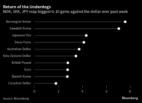 日元、挪威克朗、瑞典克朗和南非兰特 —— 今年以来表现最差的主要货币—— 在过去一周领涨全球汇市。发生这一急剧变化,是因为美国通胀降温、削弱了美元汇率。
