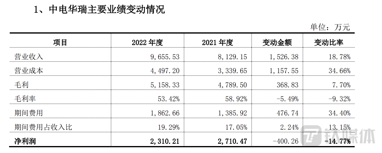 另外,中电华瑞的毛利率也在下滑,由2021年的58.92%下滑至2022年的53.42%,下滑5.49个百分点。公司表示毛利率下降主要是因为客户需求变化,高毛利率产品销售占比降低,低毛利率占比提高,导致毛利率降低。