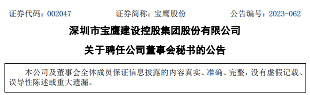 深圳市宝鹰建设控股集团股份有限公司(以下简称“公司”)于2023年6月5日召开第八届董事会第四次会议,审议通过了《关于聘任公司董事会秘书的议案》, 同意聘任左桃林先生为公司董事会秘书(简历详见附件),任期自本次董事会审议通过之日起至第八届董事会任期届满之日止,公司独立董事已就该事项发表了同意的独立意见。