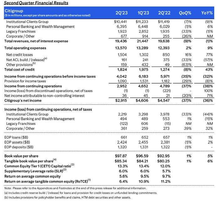 7月14日美股盘前,花旗(C.US)公布了2023年第二季度财务业绩。数据显示,Q2营收为194.4亿美元,同比下降1%,较市场预期高出1.2亿美元。非GAAP每股收益为1.37美元,与预期一致。每股收益为1.33美元,同比下降39%,但高于市场预期的1.30美元。受支出增加、信贷成本高企、市场业务收入和投行业务收入下降的影响,花旗Q2净利润同比暴跌36%至29.15亿美元。