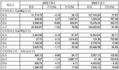 货运方面,2023年6月货运运力投入(按可利用吨公里一货邮运计)同比上升17.25%;货邮周转量(按收入吨公里一货邮运计)同比上升0.46%;货邮载运率为52.08%,同比下降8.70个百分点。