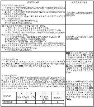 根据《公司2021年限制性股票激励计划》等相关规定,公司对2021年限制性股票激励计划第一个解除限售期规定的条件进行了审查,公司2021年限制性股票激励计划第一个解除限售期解除限售条件已经成就,本次符合解除限售条件的激励对象共计130人,可解除限售的限制性股票数量为7,298,640股,占公司当前总股本的0.32%。